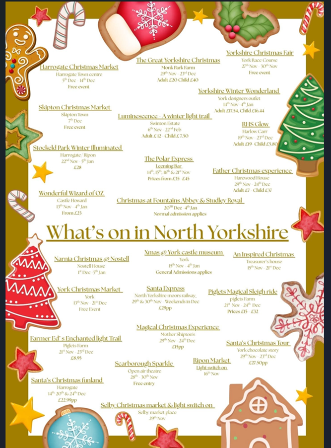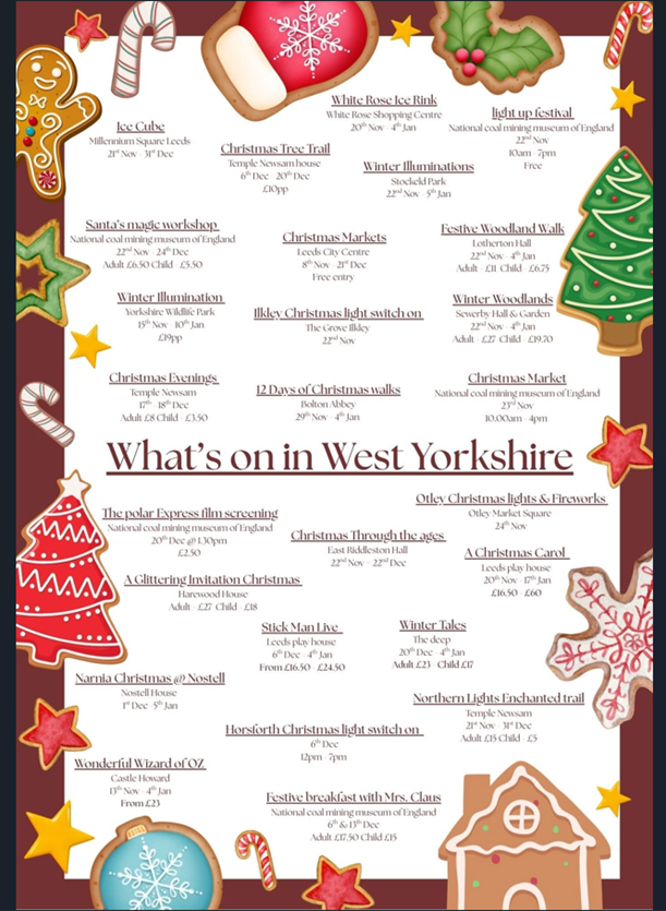 As we head into the Christmas season, I wanted to share some activities that are happening across West and North Yorkshire that you might want to get involved in with your child or children. I appreciate that this can be an expensive time of year for all families, so we have tried to collate events that are free for people to get involved in. I hope that these are of some use for you and your families.